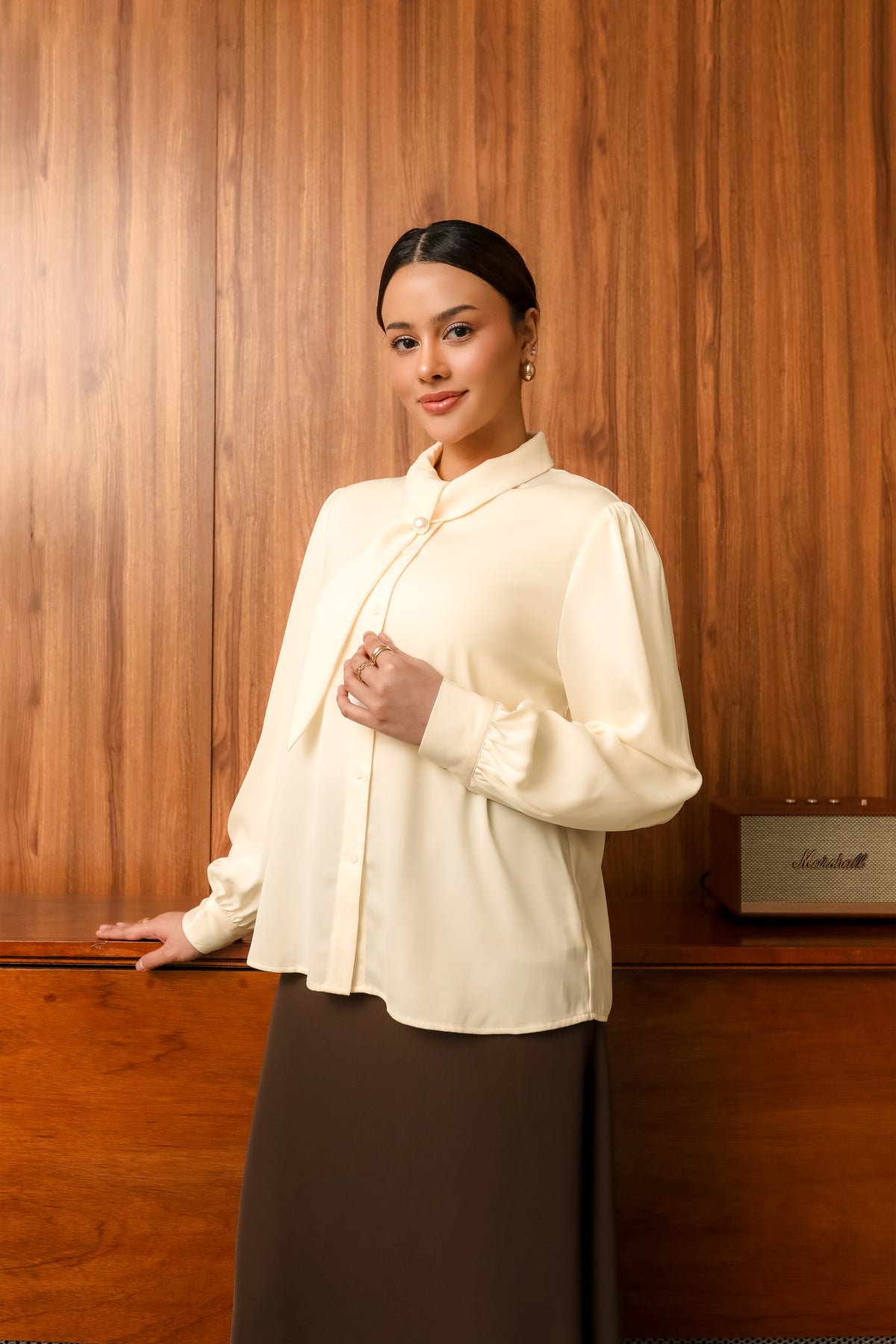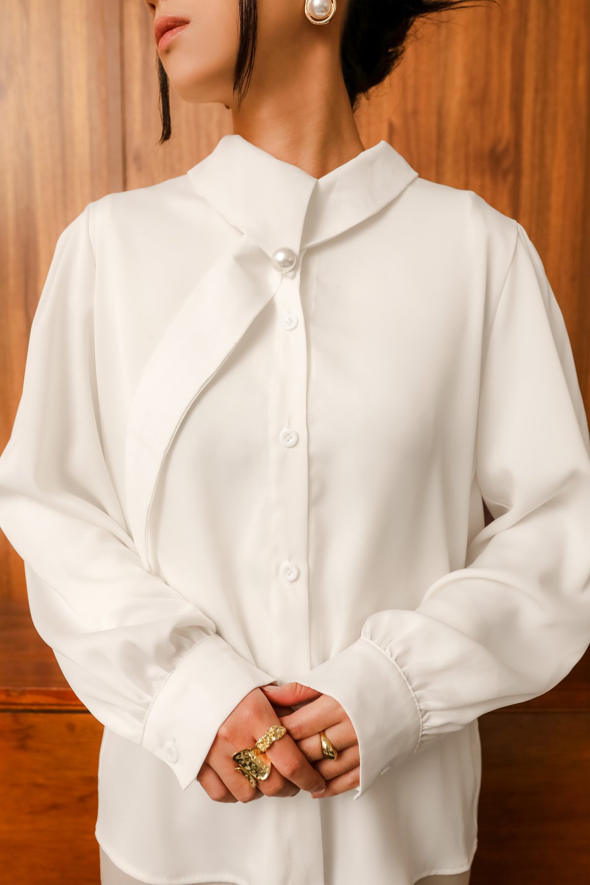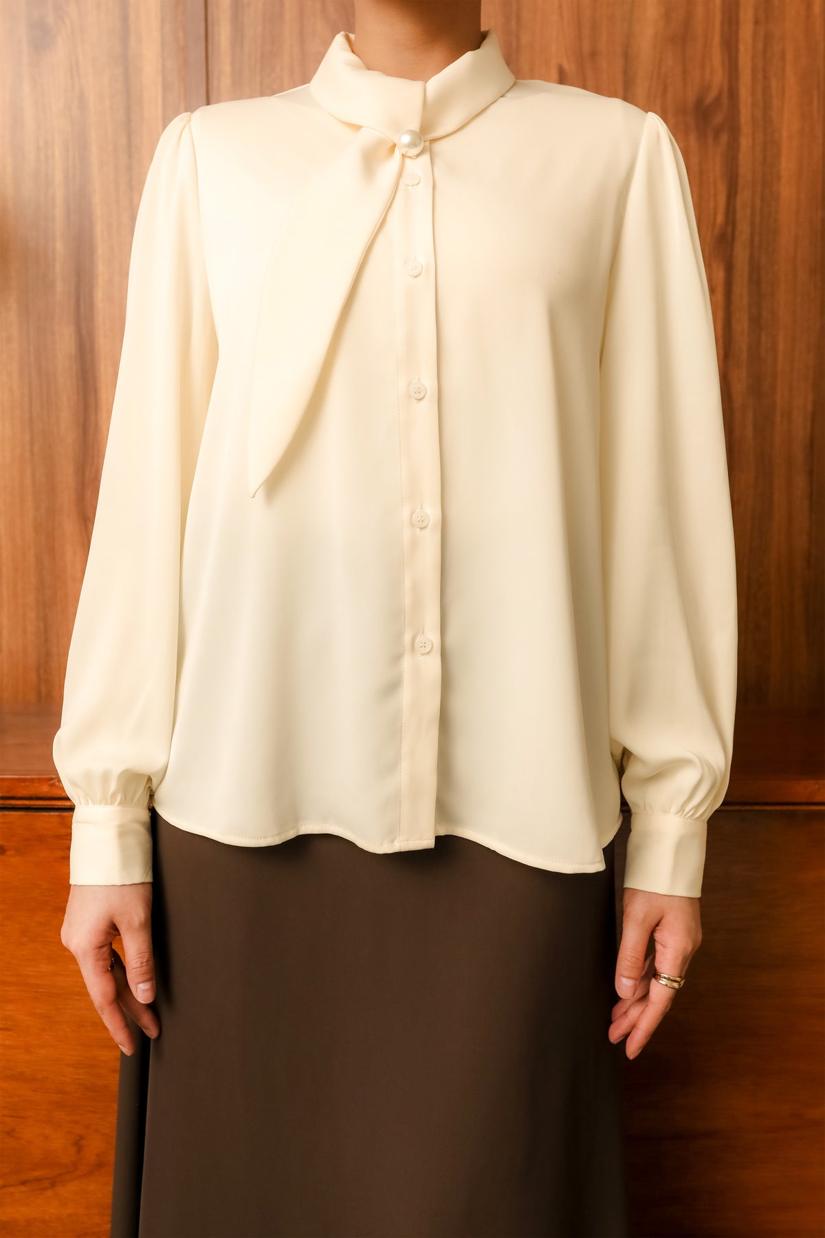 Kemeja wanita ini hadir dalam tiga pilihan warna basic yang timeless. Didesain dengan bukaan depan full hidden button, menciptakan tampilan clean dan rapi. Model lengan puff dengan manset memberikan volume yang anggun sekaligus menambah kesan feminin.