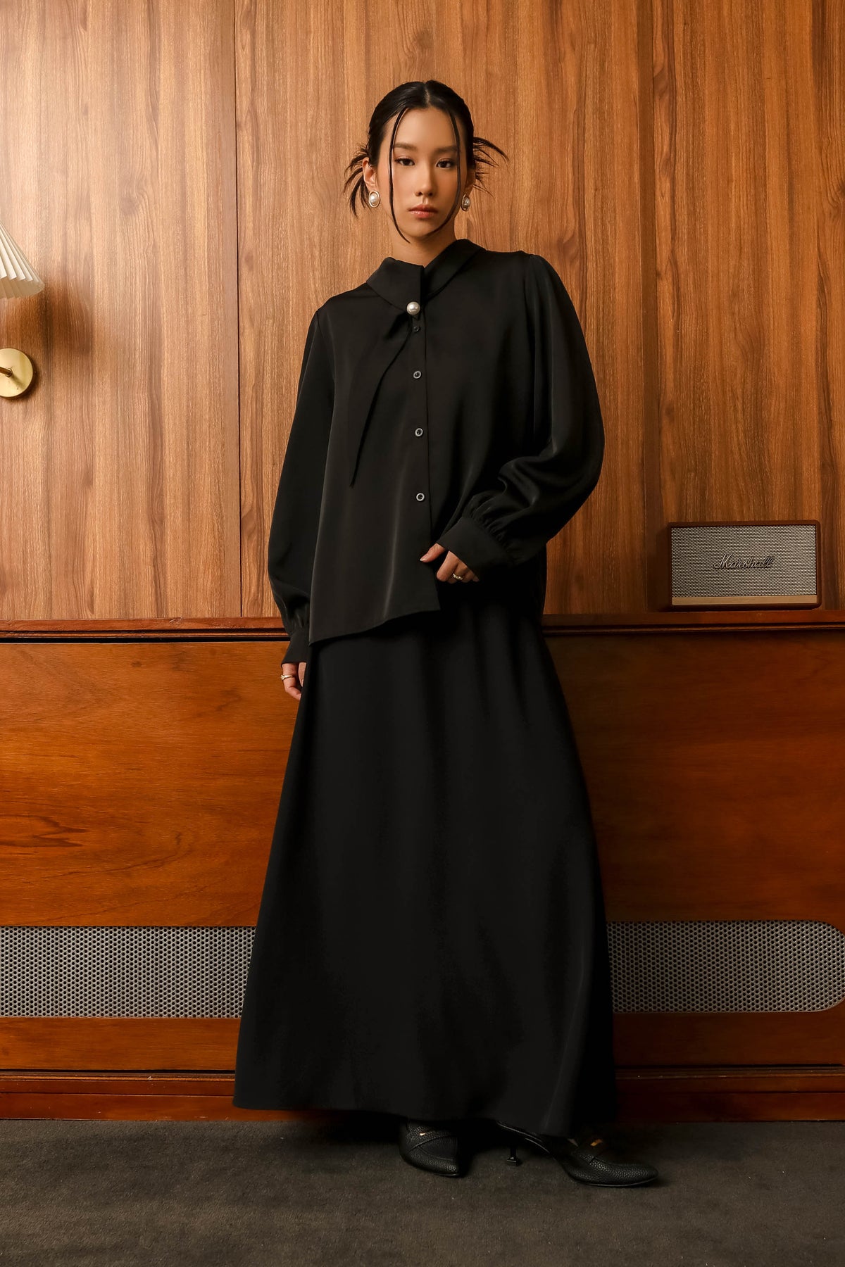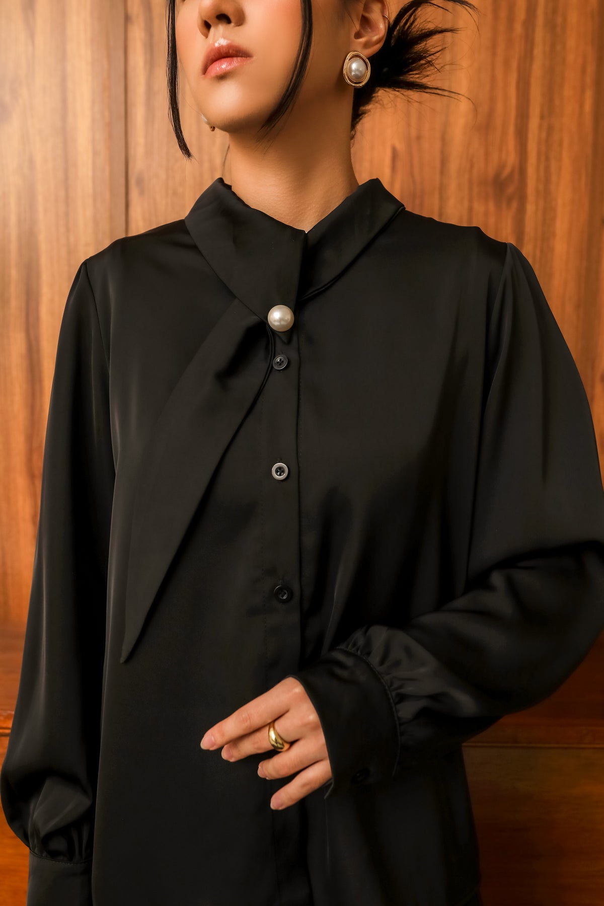 Bagian kerah dihiasi kancing jamur ber-statement yang menjadi focal point, menghadirkan gaya chic dan elegan dalam satu look. Terbuat dari bahan silk yang lembut, adem, dan jatuh di tubuh, membuatnya sangat nyaman dikenakan sepanjang hari.