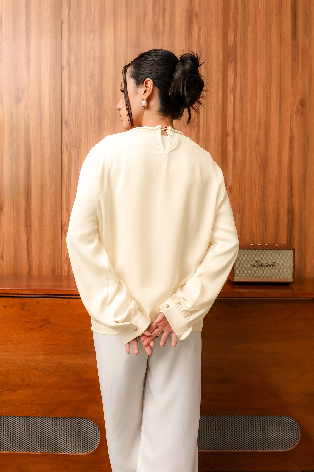 Didesain dengan kerah bulat berhias detail kepang serta aksen bunga mawar pada manset kedua lengan, menciptakan nuansa feminin yang subtle namun berkarakter. Bagian tengah depan dihiasi drapery yang mengalir lembut, sementara bagian belakang dilengkapi bukaan kancing tersembunyi untuk kesan clean dan refined.